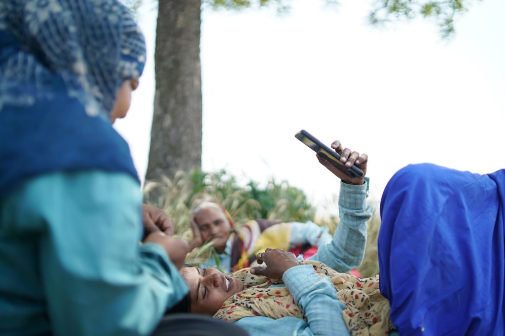 This is a portrait of a Dalit woman working, resting, creating Instagram reels, and laughing.